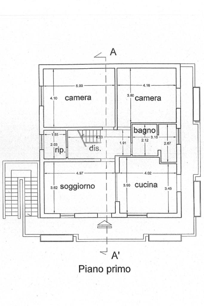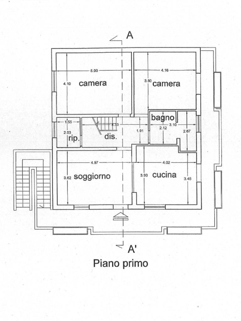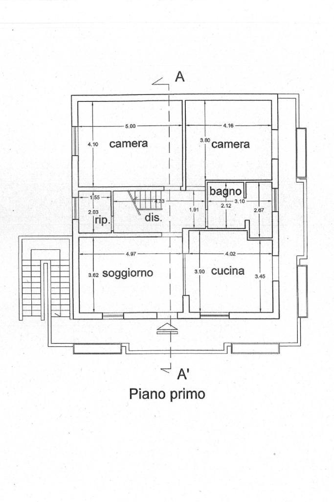 L’ingresso si apre sul primo piano, dove si sviluppa la zona giorno , parzialmente rifinita in parquet, caratterizzata da soggiorno e cucina. La zona notte comprende due camere matrimoniali, entrambe con pavimenti in parquet: una con accesso diretto al terrazzo, l’altra dotata di una comoda cabina armadio. Completano il piano un bagno finestrato con vasca e un pratico ripostiglio.